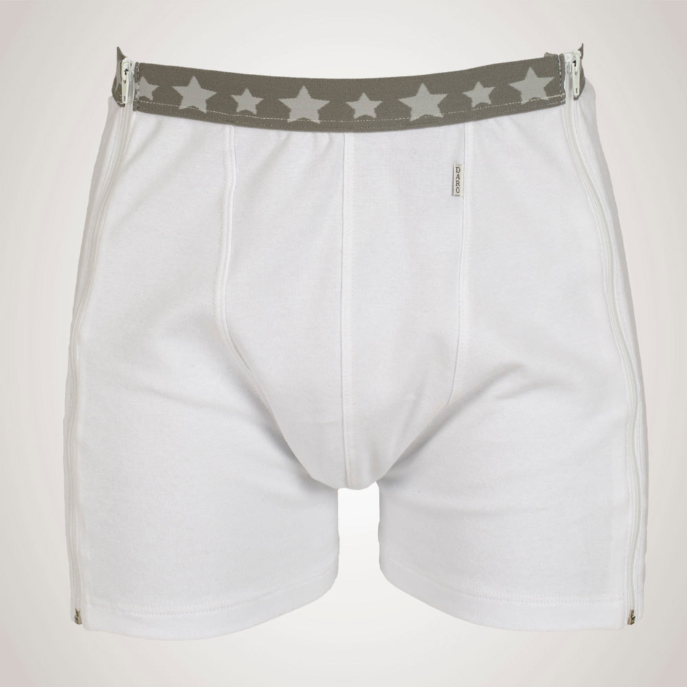 Boksershortsen har høy skjæring, korte ben og glidelåser i sidene.