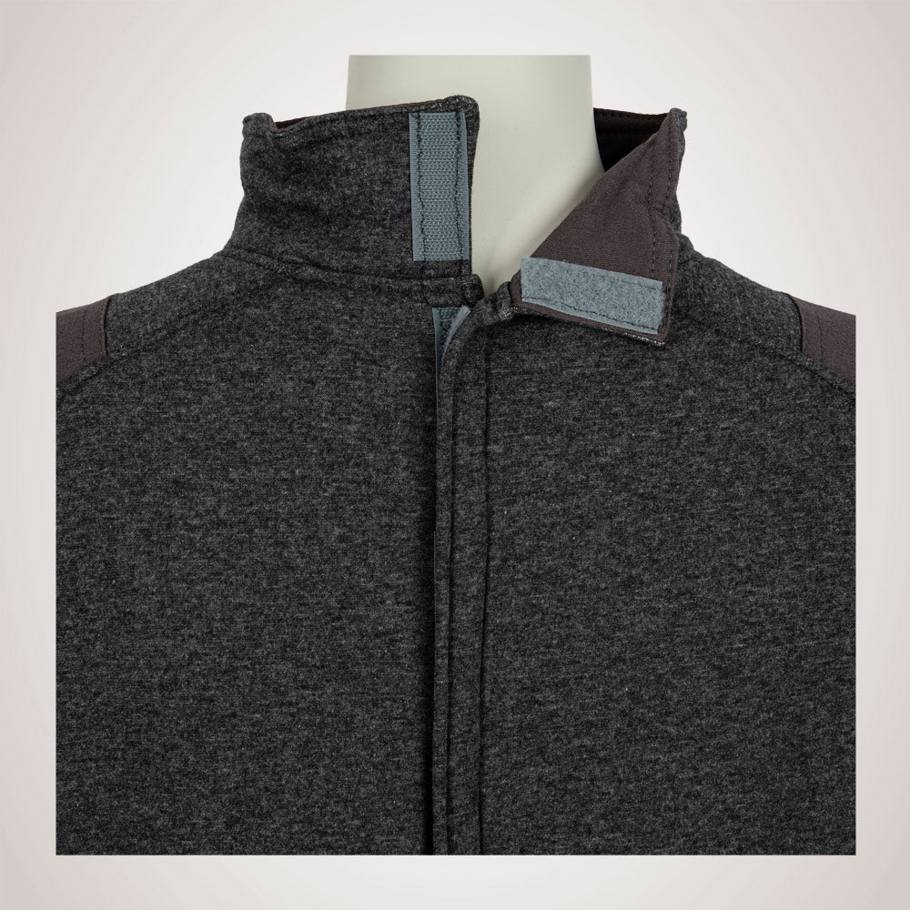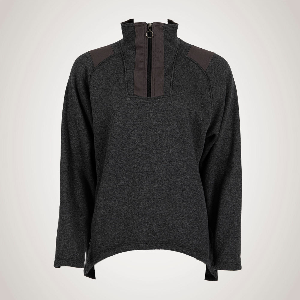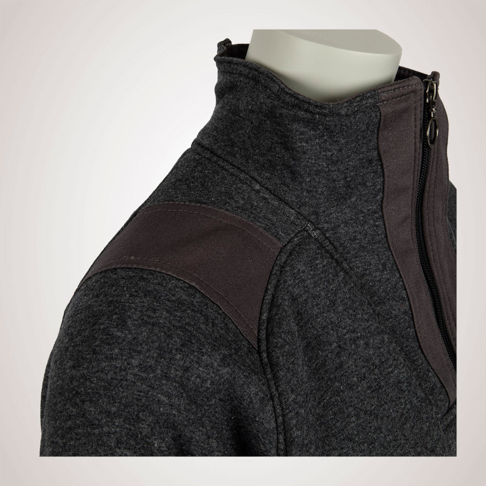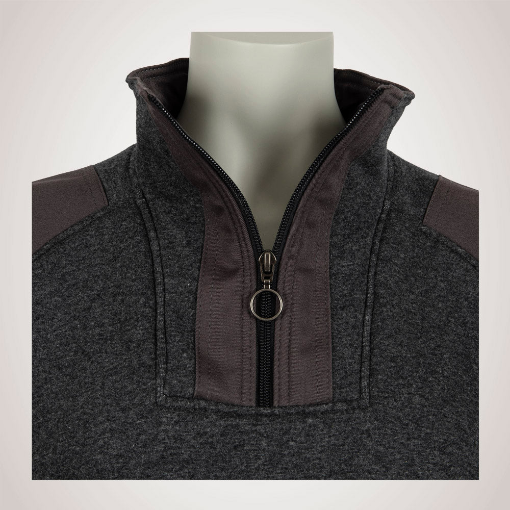 Denne modellen har en god passform med raglanermer som gir god romslighet. Den har en høy krage i myk ribbestrikk med en kort glidelås, samt ribbede mansjetter.