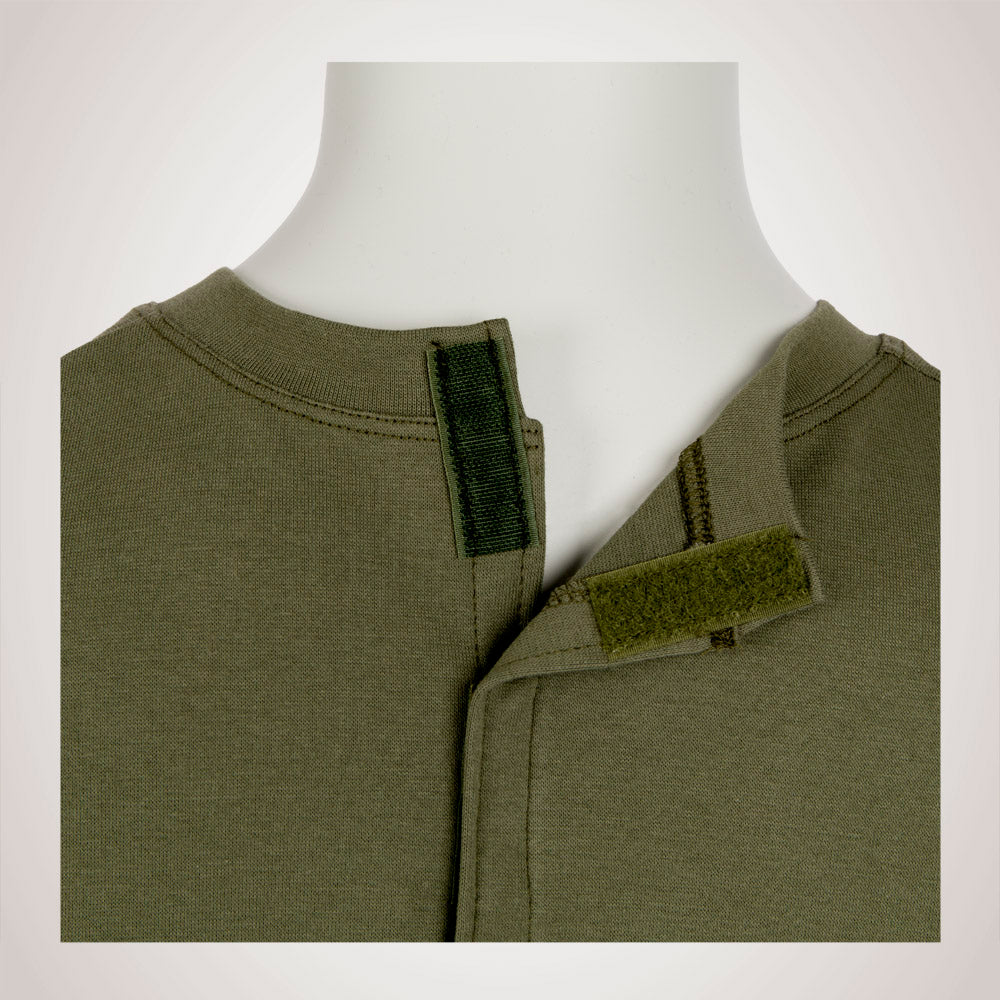 Dinesen T-skjorten er designet for rullestolbrukere, da den har en kort lengde foran og kan åpnes bak med en gripestropp.