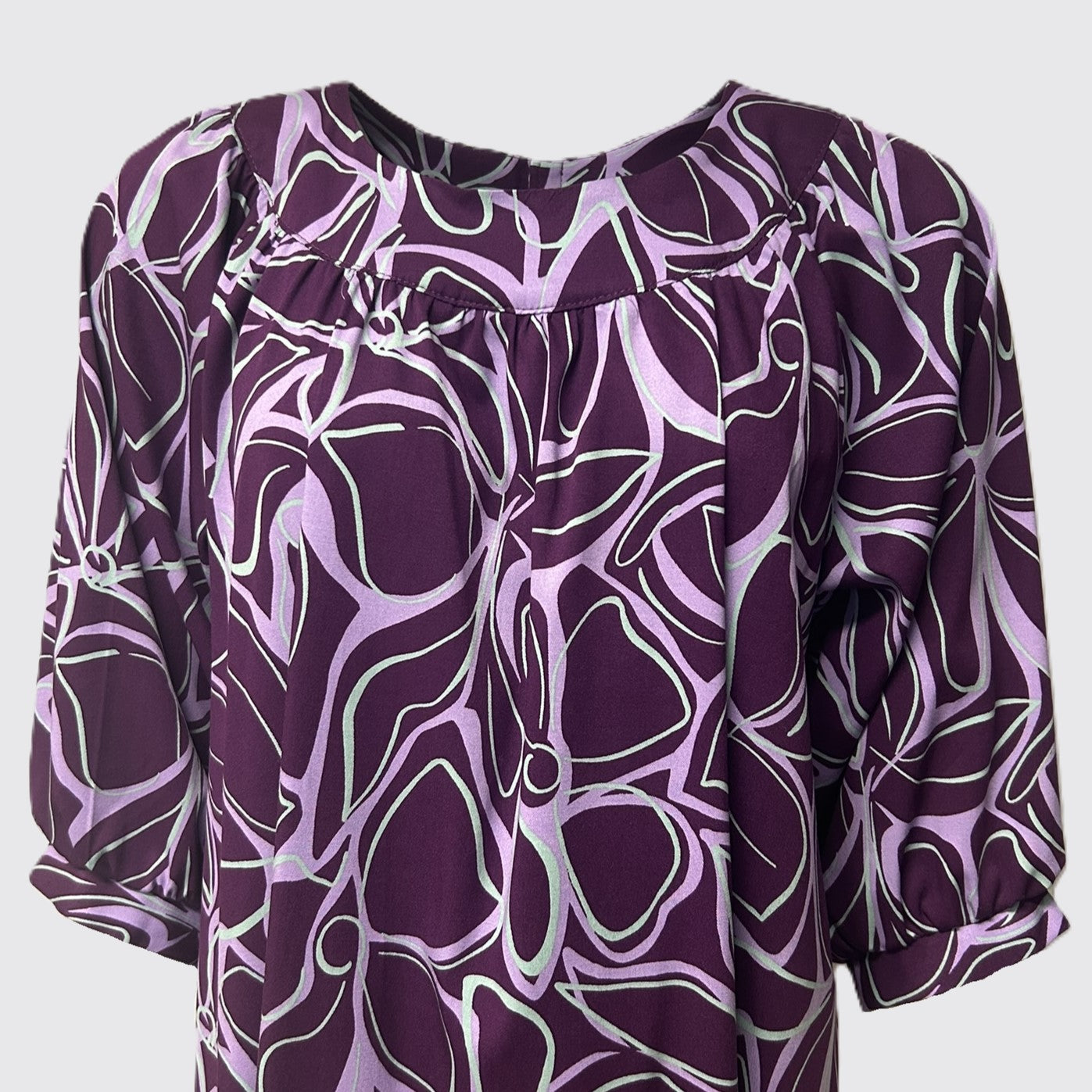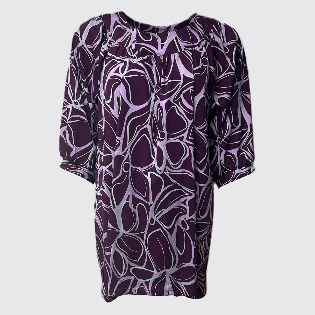 Modellen har en god passform med raglanermer som gir god romslighet. Den har en rund hals med folder som faller fint nedover overdelen. Tunikaen er en lang modell som går til midt på låret.