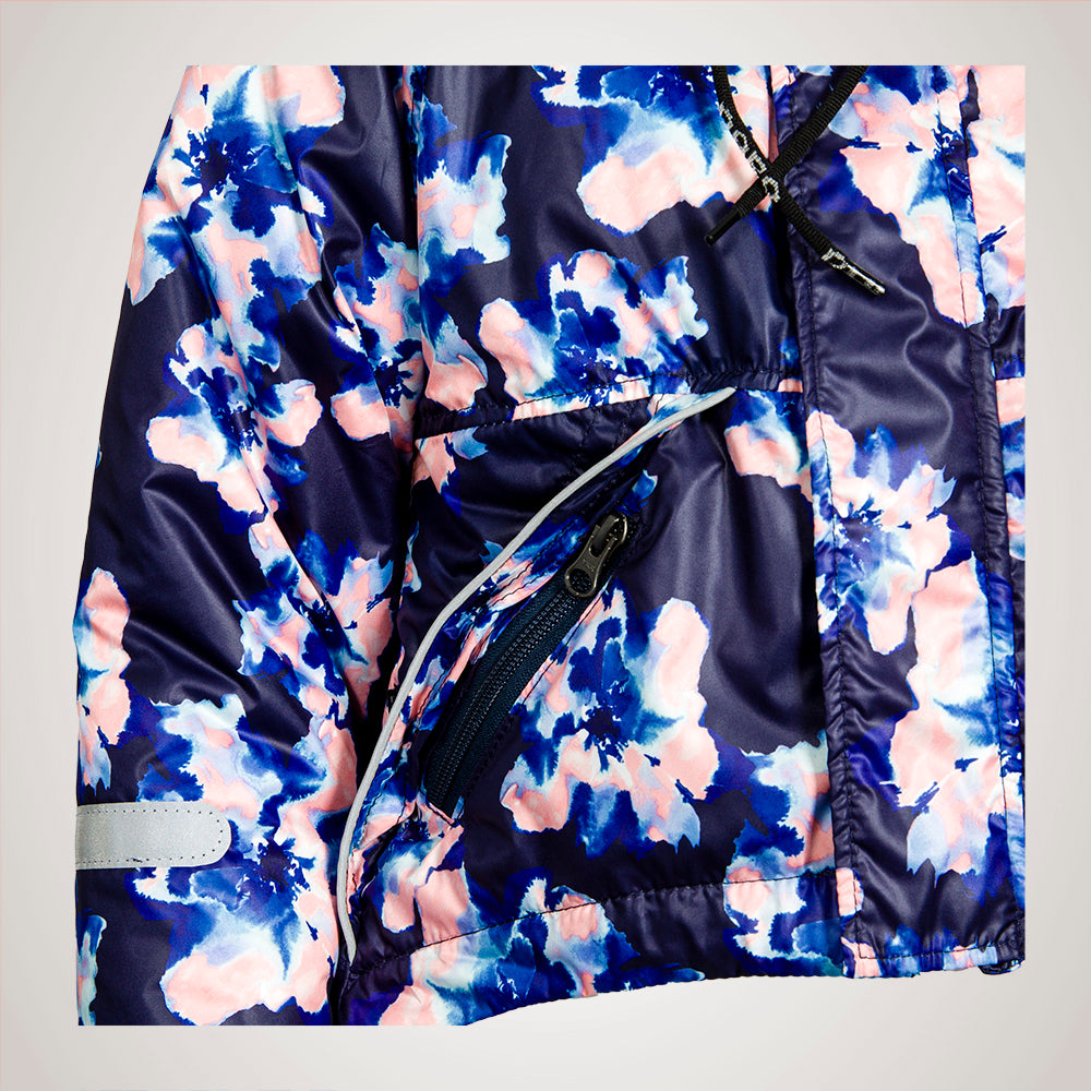 Jakkens gennemgående lynlås fra YKK har en bred stolpe foran, samt en lille stolpe bagved, så der ingen irritation forefindes fra lynlåsen. På maven, skjult under nogle brede skrå klapper, er der lommer med lynlåslukning. Der er elastik og gribebånds-regulering ved ærmekanterne.