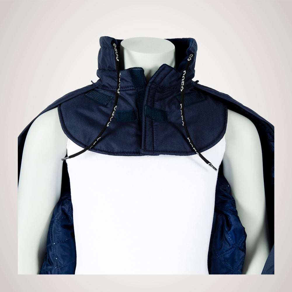 Kraven er udformet så den er høj bagtil og dækker nakken, men er kort foran, med plads til hagen. Kraven har yderligere en snor til regulering, så man kan stramme til og få dækket nakken helt, hvis hovedet har tendens til at hænge fremad. Der er elastik i både ærme- og fodmanchetten, samt i taljen.