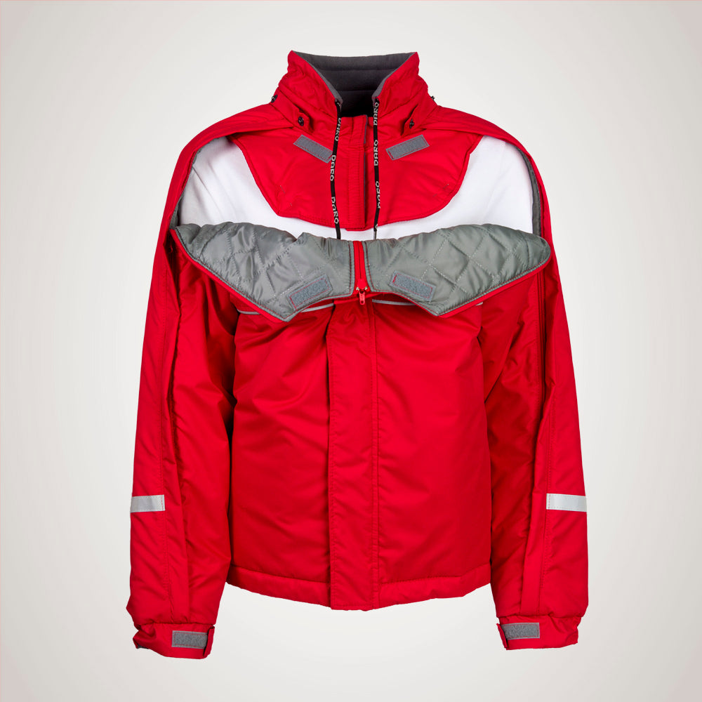 Jakken har en gennemgående lynlås fra YKK, med en bred stolpe foran. Ved hjælp af ærme-lynlåsene og en indvendig klap, er det muligt at åbne jakken helt op, så det er nemt at få jakken på. Ærme-lynlåsene er gemt bag en stolpe, så jakken ligner en helt almindelig jakke. Der er elastik og gribebånds-regulering ved ærmekanterne.