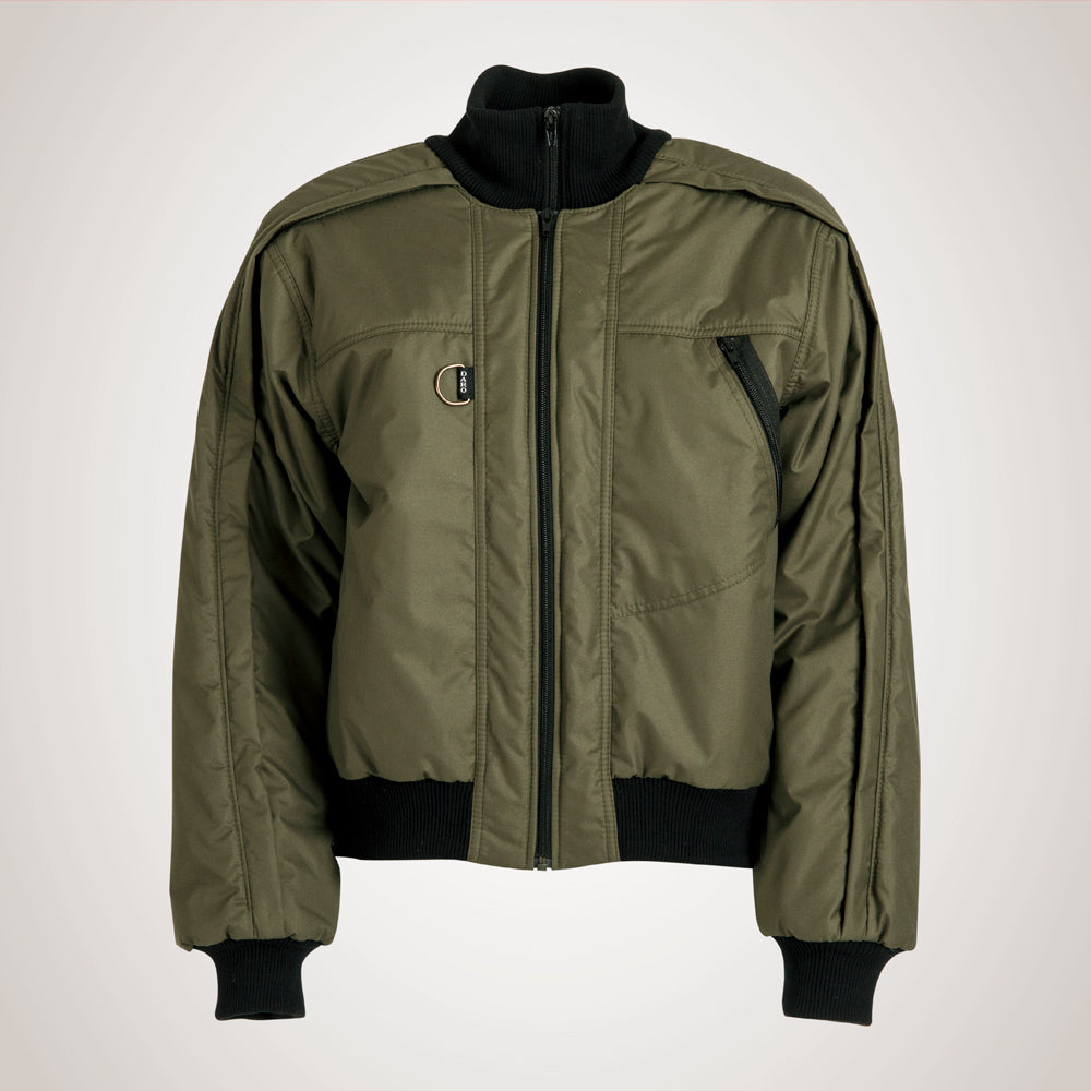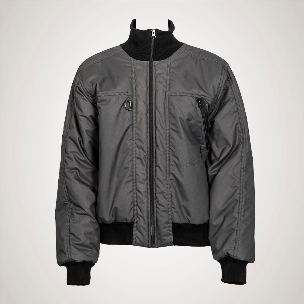 Kraven, ærme-manchetten og taljen er syet i en kraftig ribkvalitet, for et smart og råt look, der samtidig er blødt og behageligt mod huden. Jakken har en gennemgående lynlås midt for, og en smart brystlomme med lynlås.