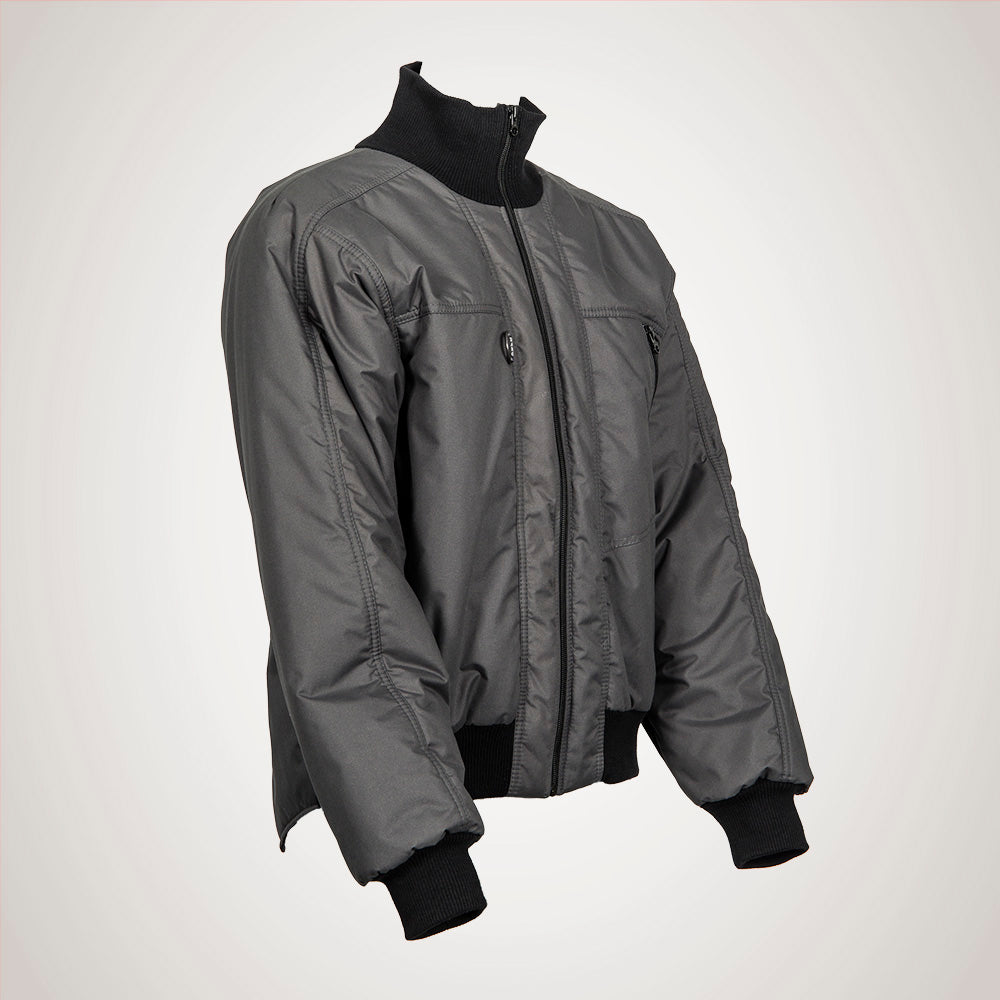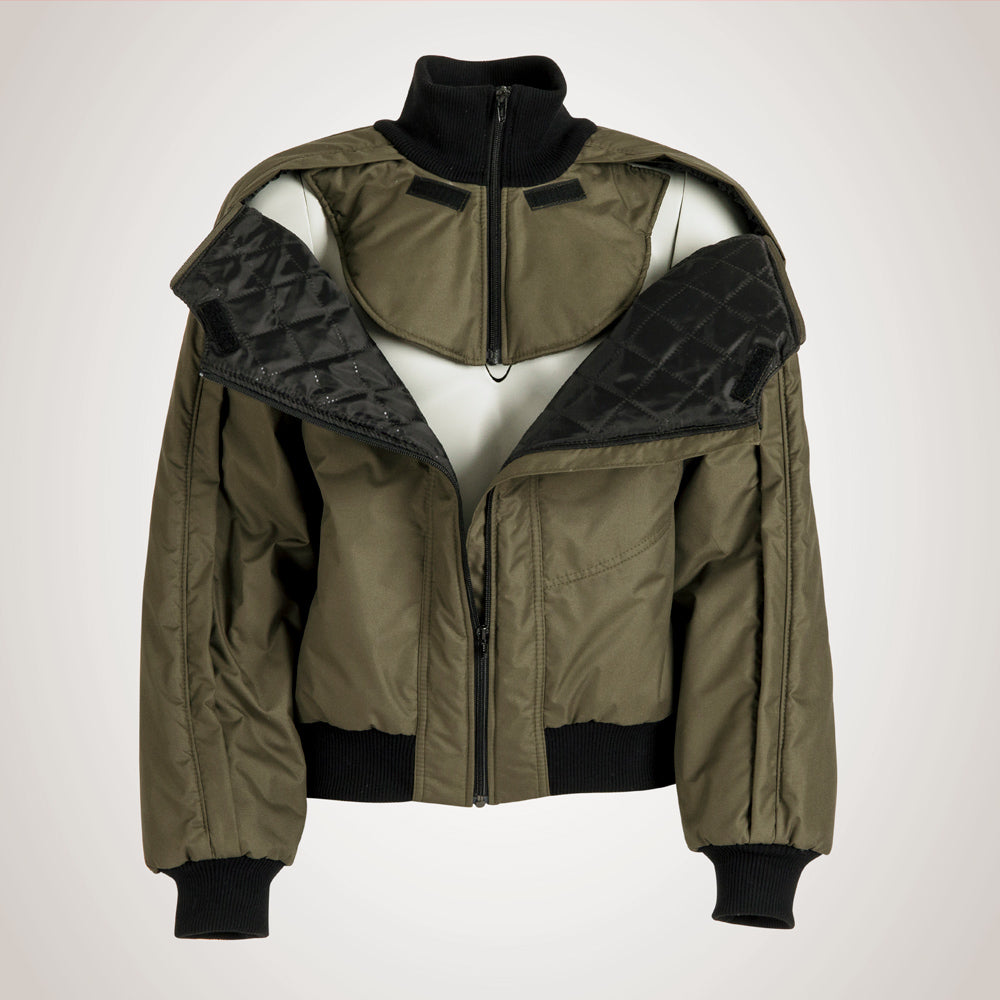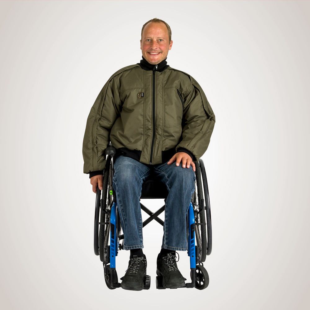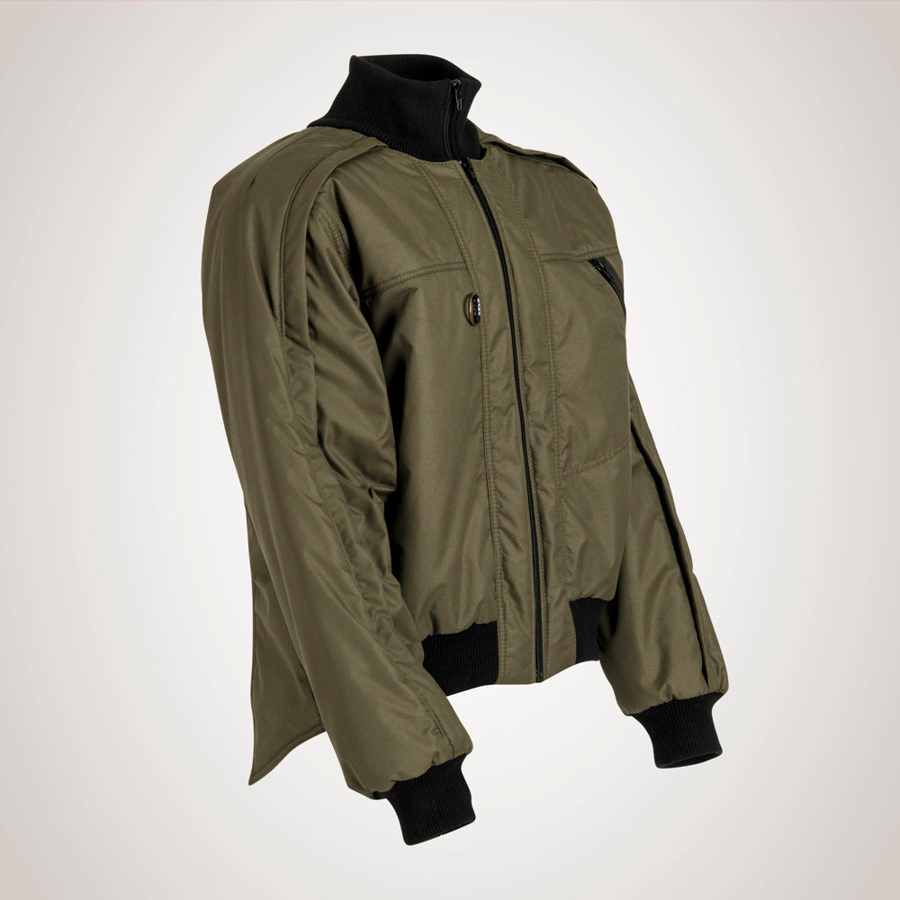 Ved hjælp af ærme-lynlåsene og en indvendig klap, er det muligt at åbne jakken helt op, så det er nemt at få jakken på. Ærme-lynlåsene er gemt bag en stolpe, så jakken ligner en helt almindelig jakke.