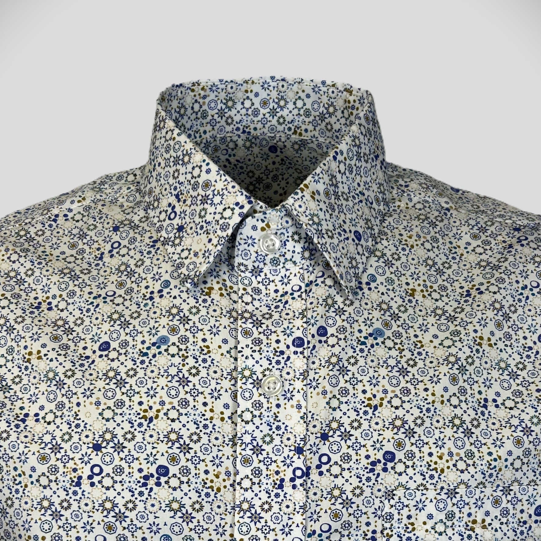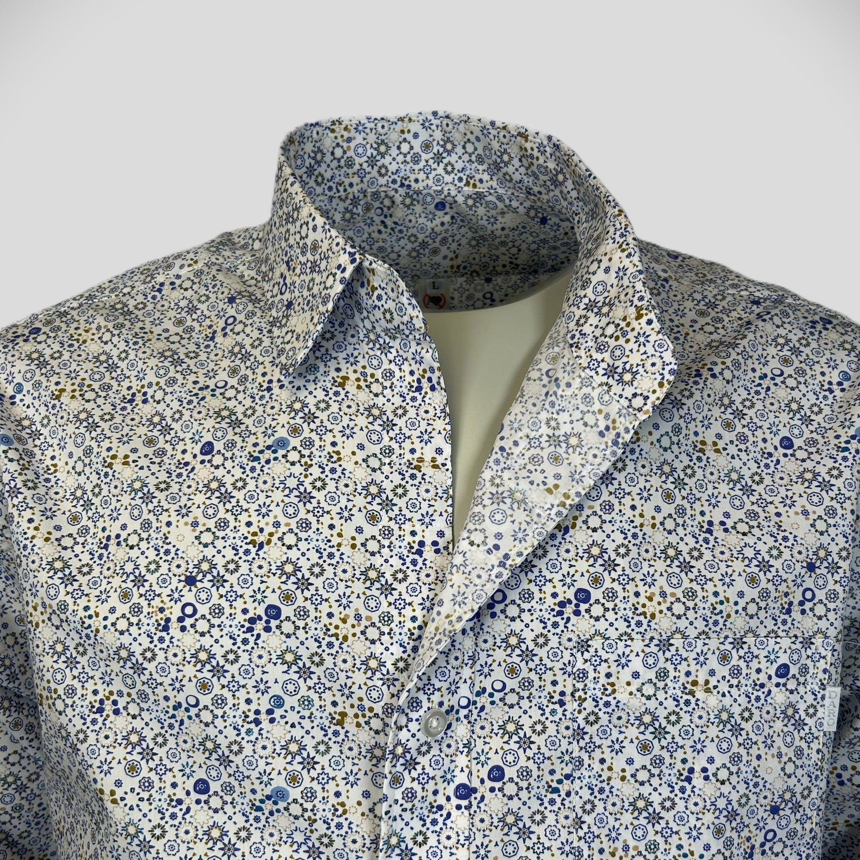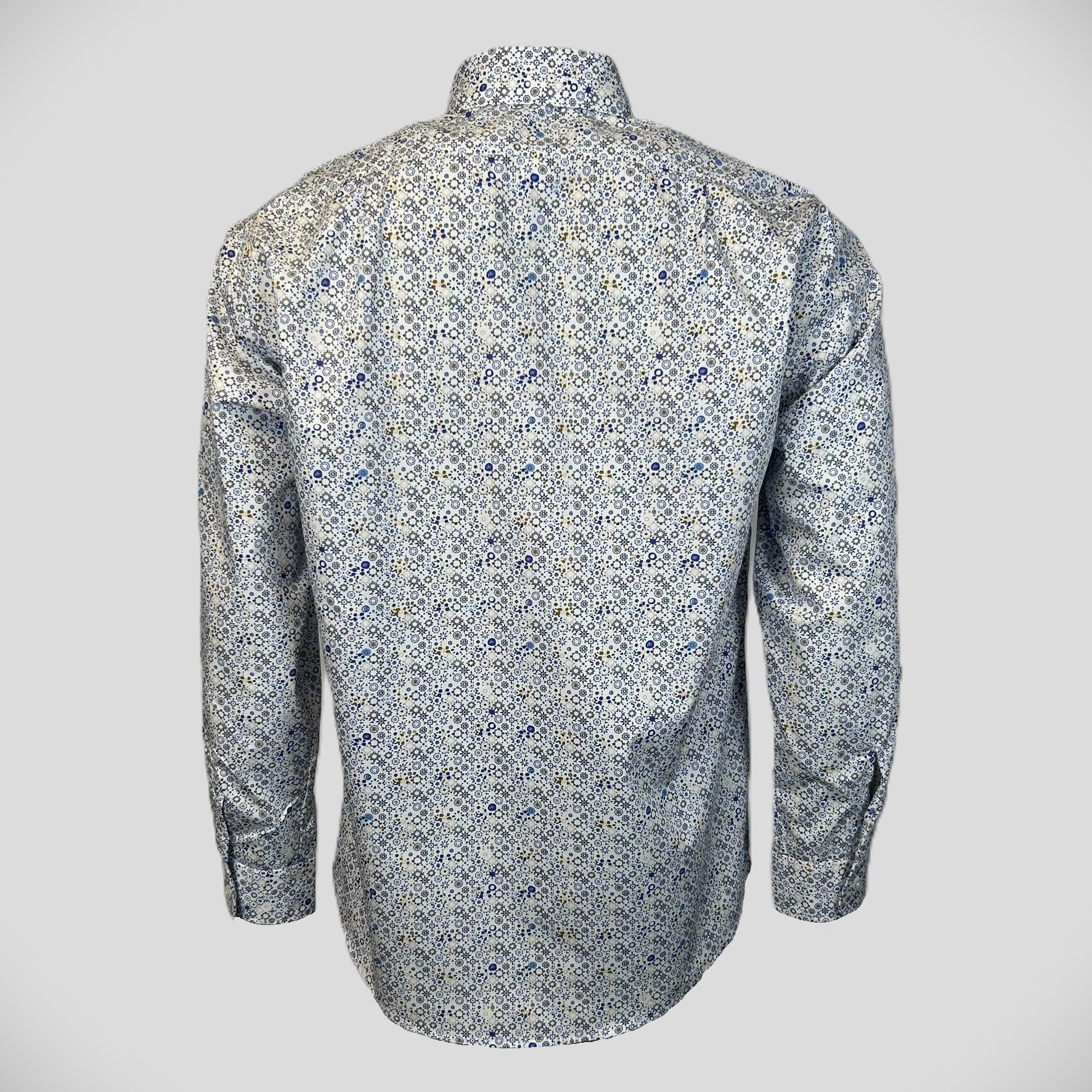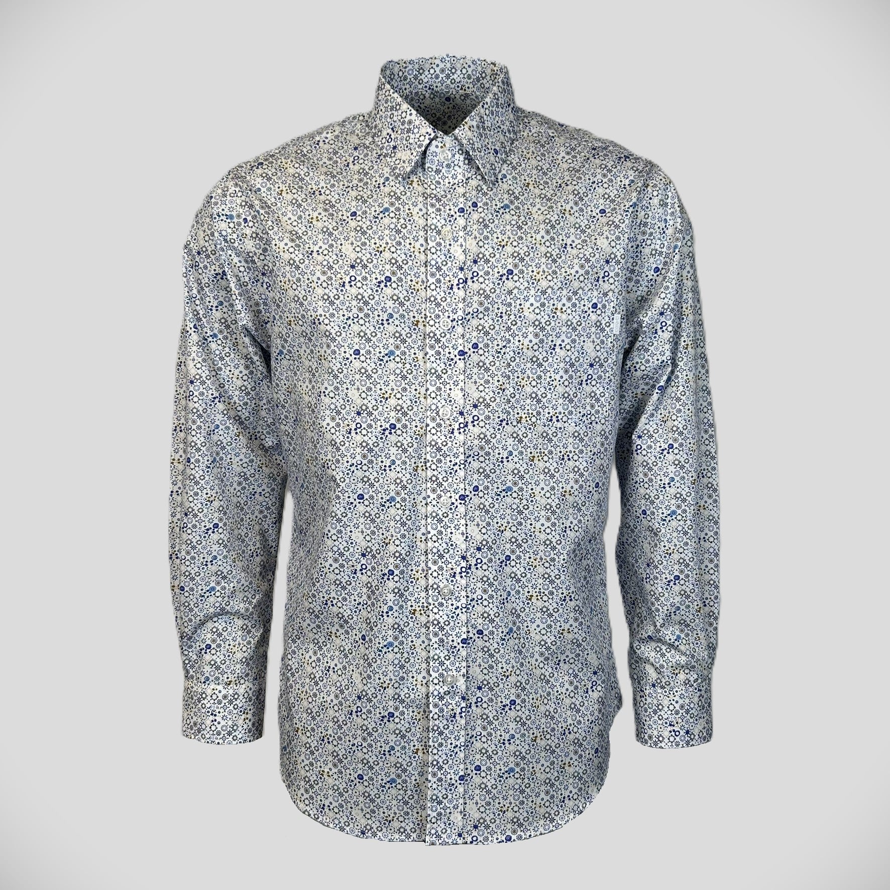 Skjorten er i reguler fit og har almindelig krave, lange ærmer, læg på ryggen, brystlomme og ærmemanchet med slids. Magneterne foran i stolpen og i hver ærmemanchet er indsyet og dermed skjulte. Ovenpå er syet hvide knapper, for et klassisk og almindeligt look.