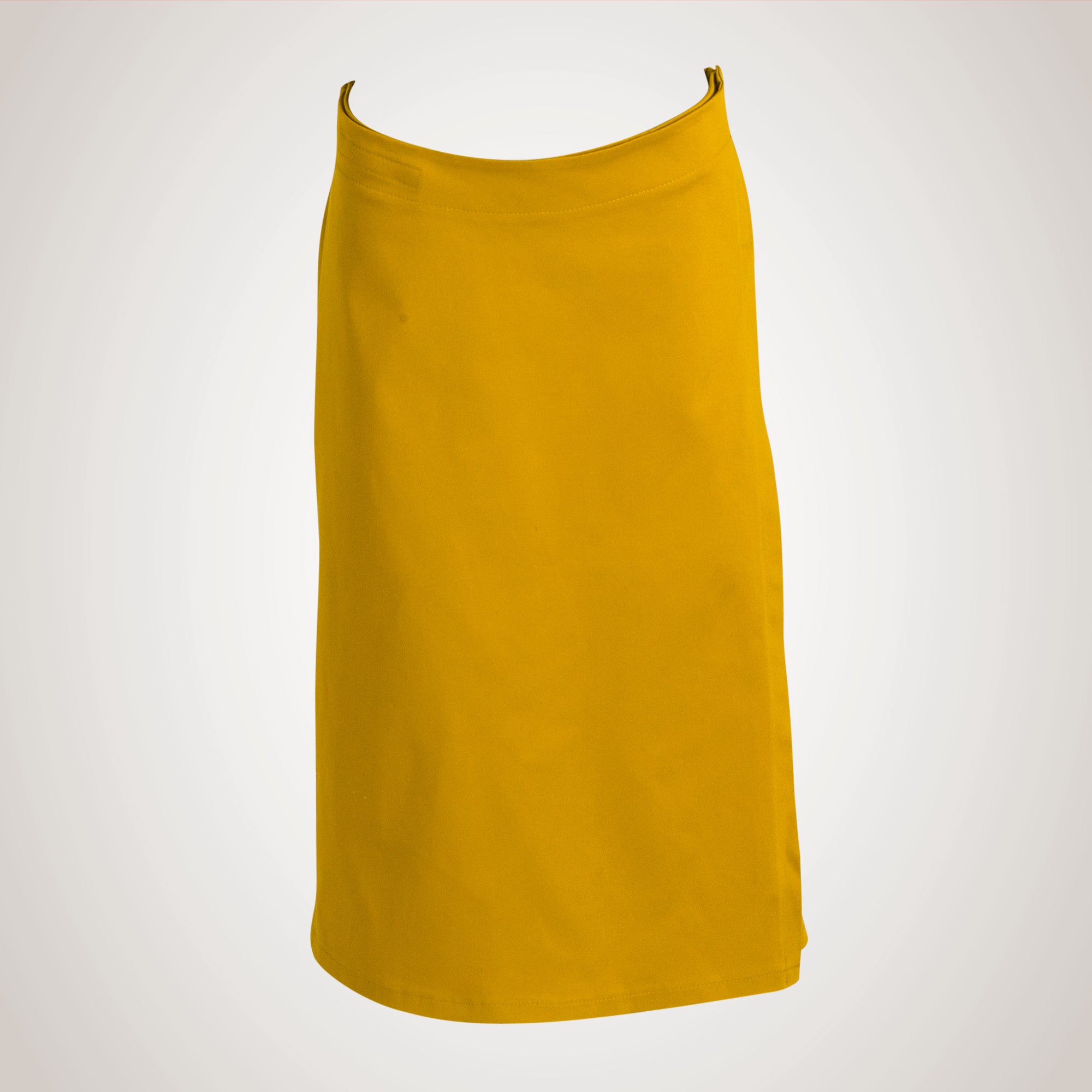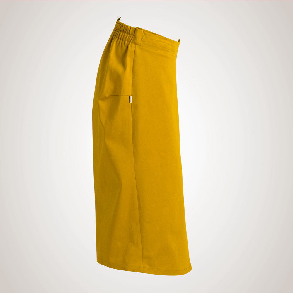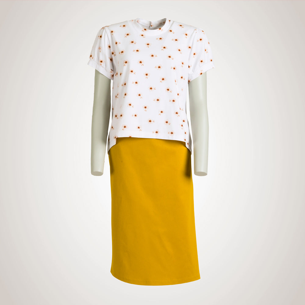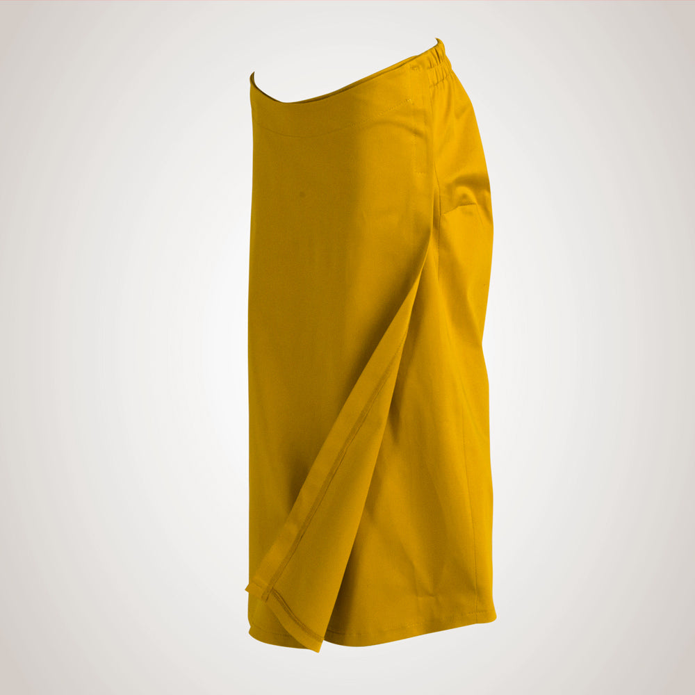 Nederdelen er enkel i designet, og har en elastik bagpå rundt i taljen. Den er knælang og åbnes og lukkes i siden med gribebånd.
